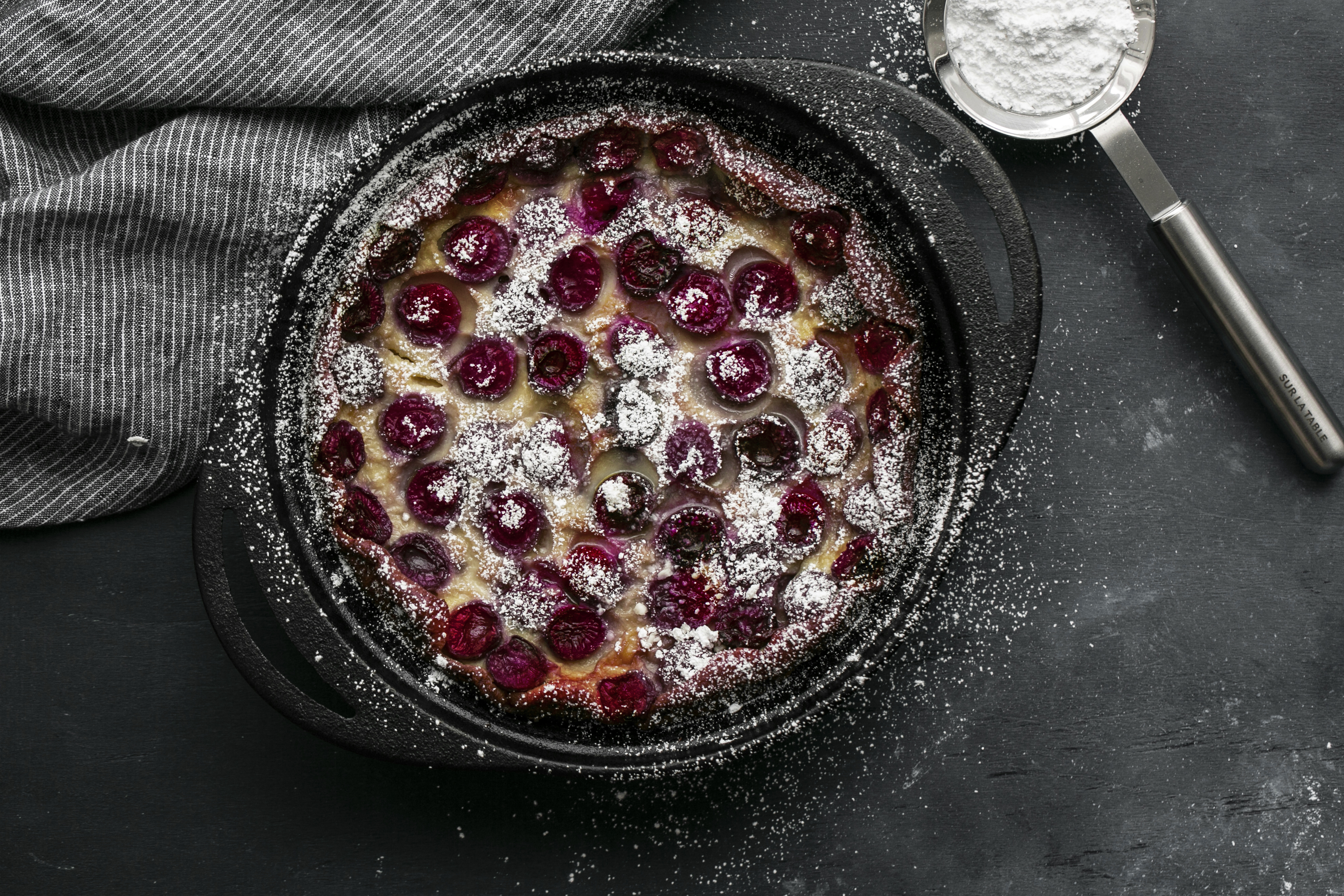 Mix flour, sugar, and salt in a bowl. Whisk in milk, eggs, butter, and vanilla until you have a smooth batter. Grease a cast-iron skillet and scatter cherries to cover the surface in a single layer, then pour over the batter. Bake at 350 F for around 50 minutes, until it’s risen like a cake and a knife inserted in the center comes out clean. Let cool slightly, then slice and serve dusted with powdered sugar and topped with whipped cream.