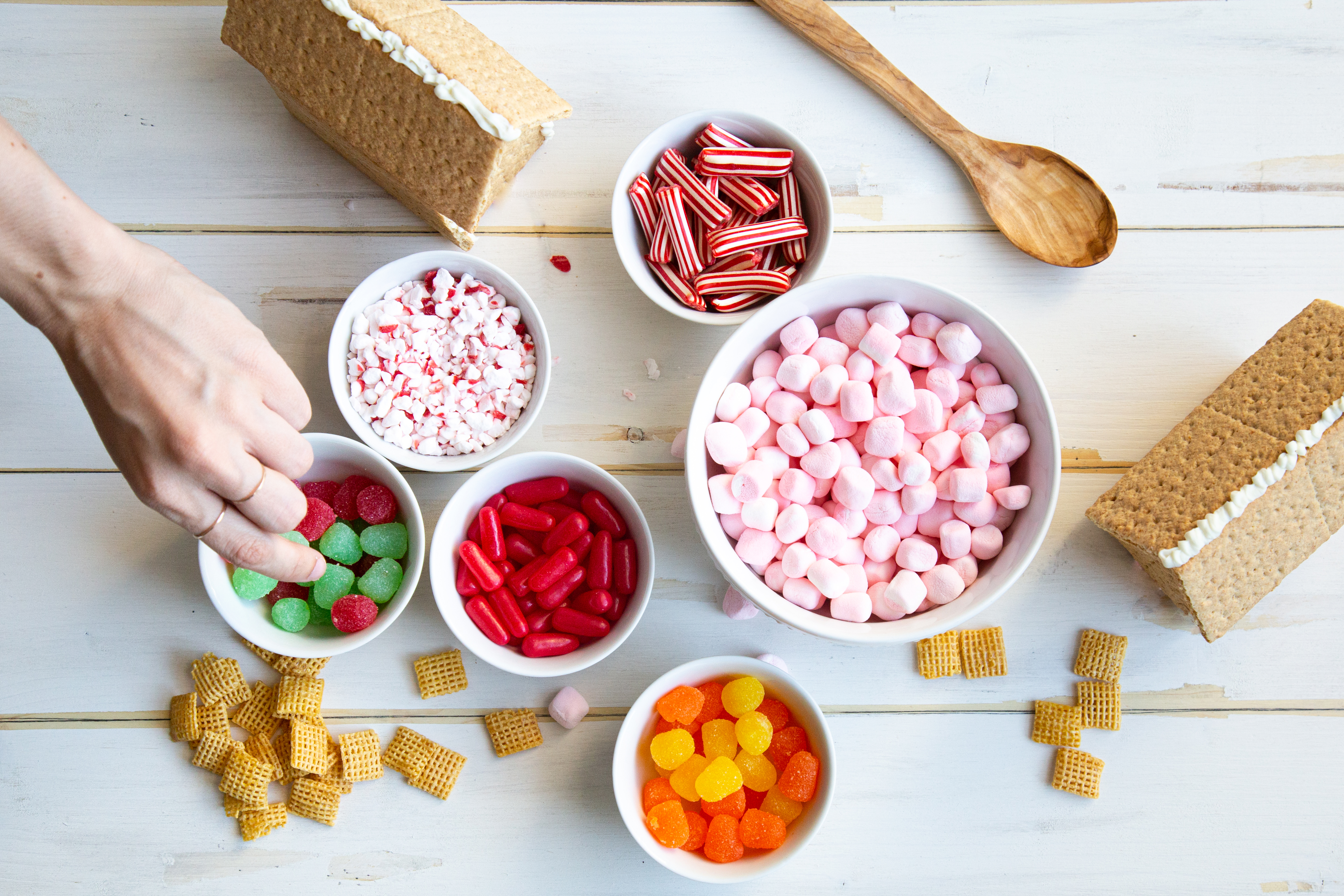 Amp up your curb appeal with frosting, gumdrops, M&M’s, mini candy canes, licorice sticks, lemon drops, Whoppers, and cinnamon Red Hots. Don’t forget the colored mini marshmallows — they’re indispensable for landscaping.