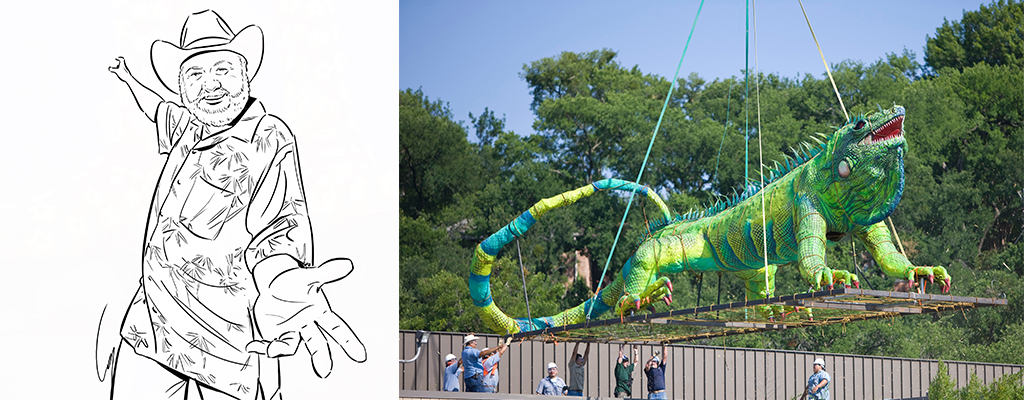 Bob “Daddy-O” Wade doesn’t fit into the same category as Texas’ naïve or self-taught artists, but his whimsical, outlandish, swaggering style of Texas pop art and surrealist playfulness blur the lines between Lone Star vernacular and art world establishment. One of the so-called Oak Cliff Four, Wade is perhaps best known for his role in shaping the look and tone of the 1970s’ Cosmic Cowboy counterculture. Some of his beloved pieces include a massive, 40-foot iguana that once graced the roof of the Lone Star Cafe in New York City and the world’s largest pair of cowboy boots, which sits outside of a mall in San Antonio.