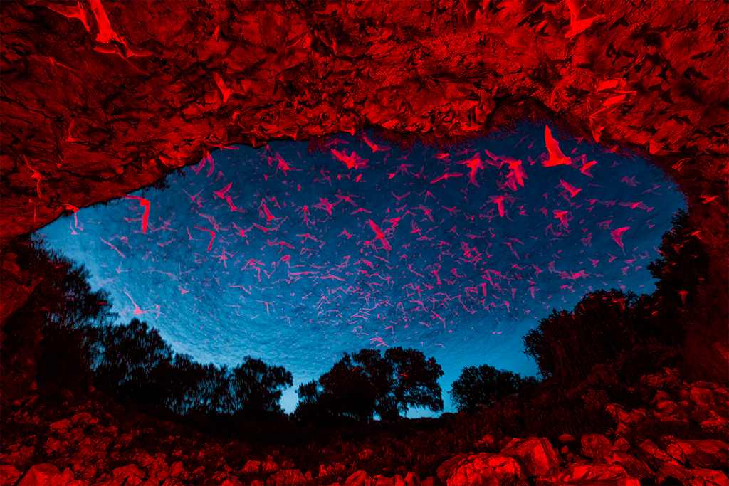 Photographing the Bracken Cave bats isn’t easy. First of all, the sheer number of bats in the sky is overwhelming. And to photograph them, Aigner needed to obtain special permission and use light-sensitive equipment such as infrared flashes. To top it off, the spectacle we see in the night sky is just the tip of the iceberg.