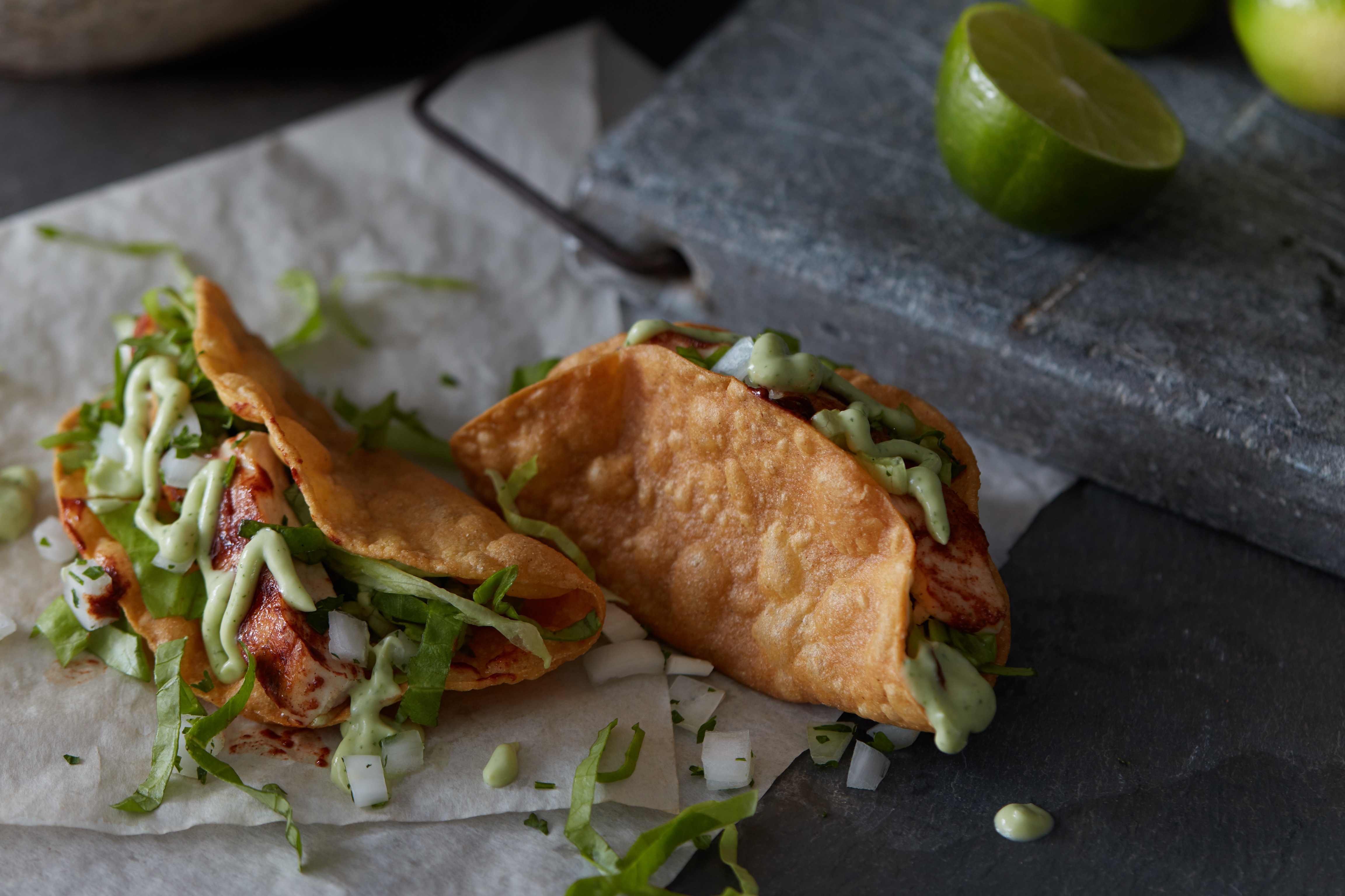 Serve tacos topped with crema plus sliced avocado, shredded lettuce, lime wedges, pickled jalapeños or onions, or any other desired toppings.