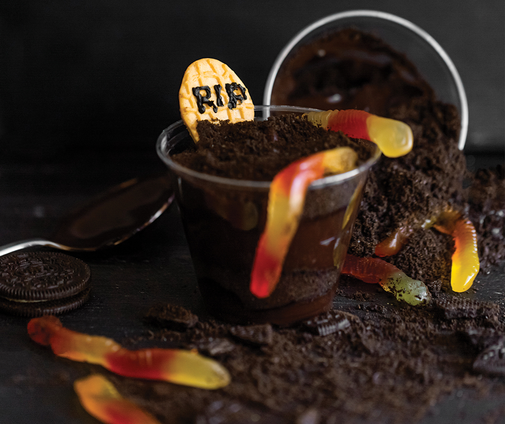 Dirt Cups: Never before has something so gross-looking tasted so good! Everyone gets a small plastic cup with a base of chocolate pudding, then goes down an assembly line of toppings to create the ultimate dirt cup. Toppings can include crushed chocolate cookies (dirt), gummy worms (worms), and green frosting (haunted grass).