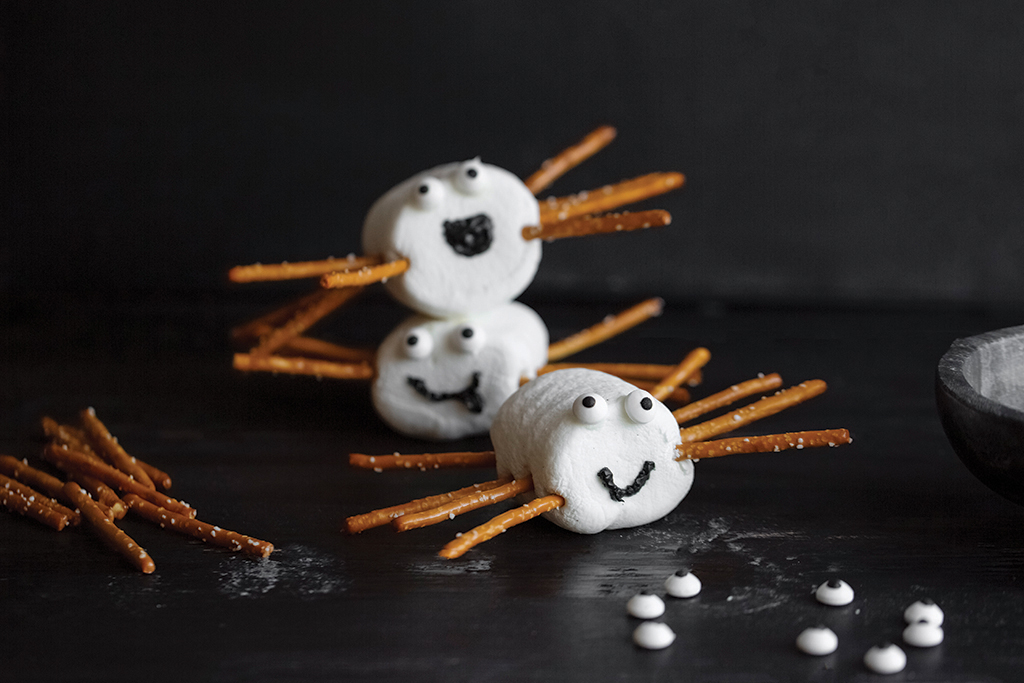 Marshmallow Spiders: Give everyone a couple of jumbo marshmallows and some pretzel sticks. They’ll insert eight pretzel sticks into the marshmallow, four on each side, to create a spider. If you want, you can use thin lines of chocolate frosting to create eyes and a mouth, giving each spider its own unique personality.