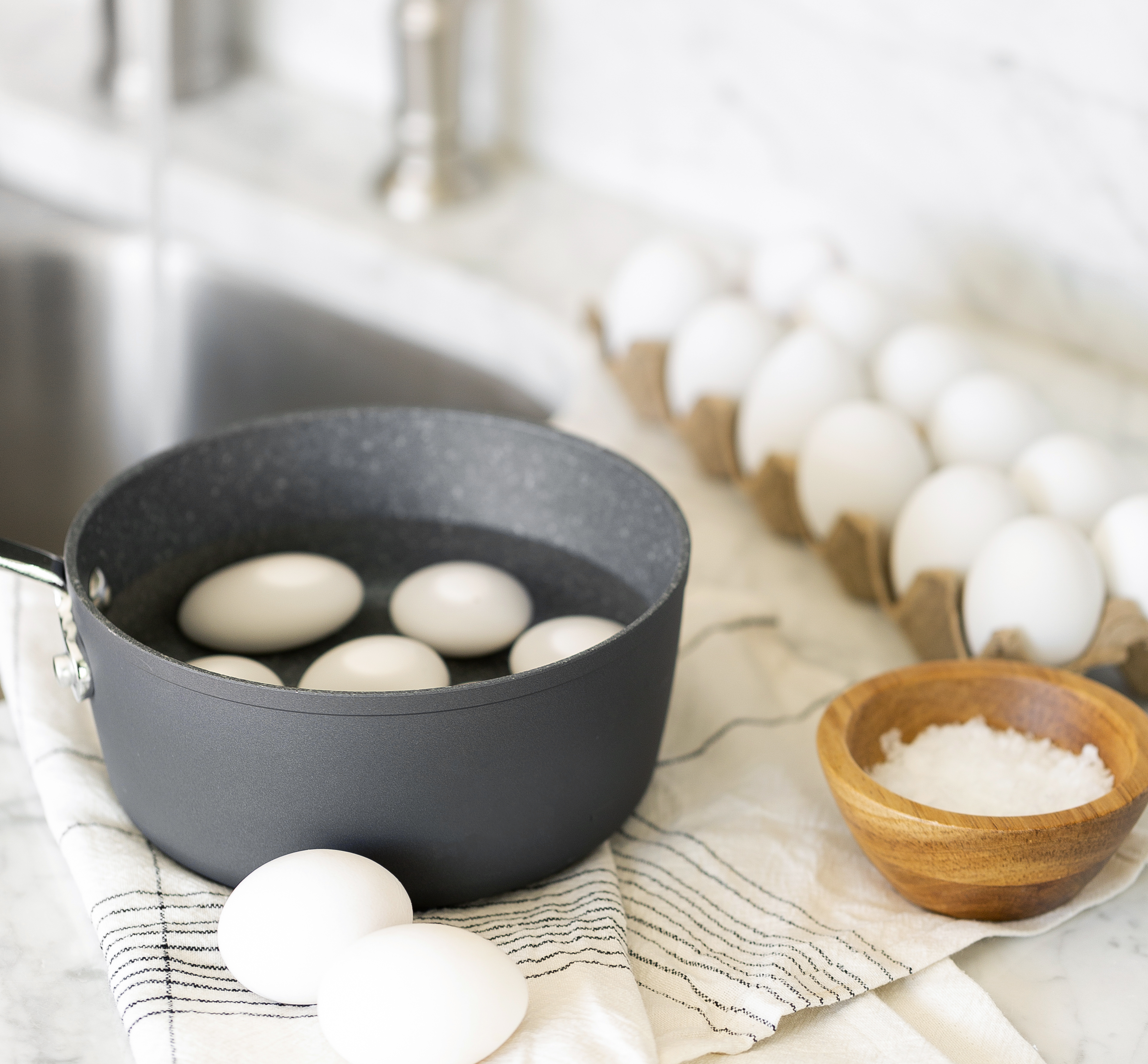 Fill the bottom of a medium-sized saucepan with large eggs.