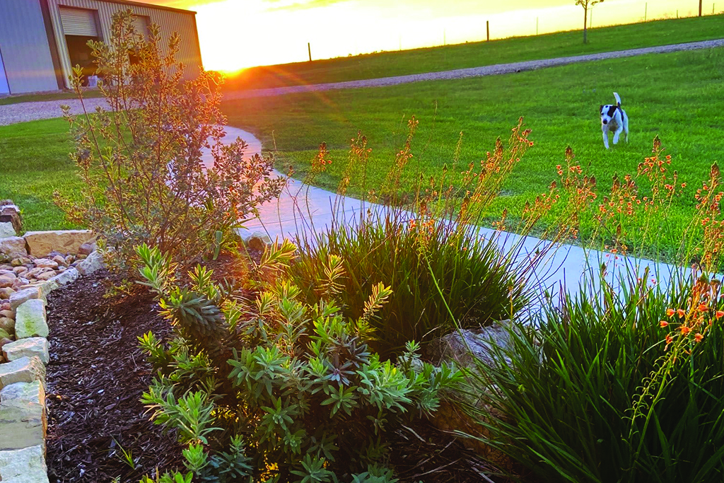 Amy Crutchfield loves the Hill Country sunsets over her native bottle brush, bulbine, and Texas sage. The pup seems to be a fan too.
