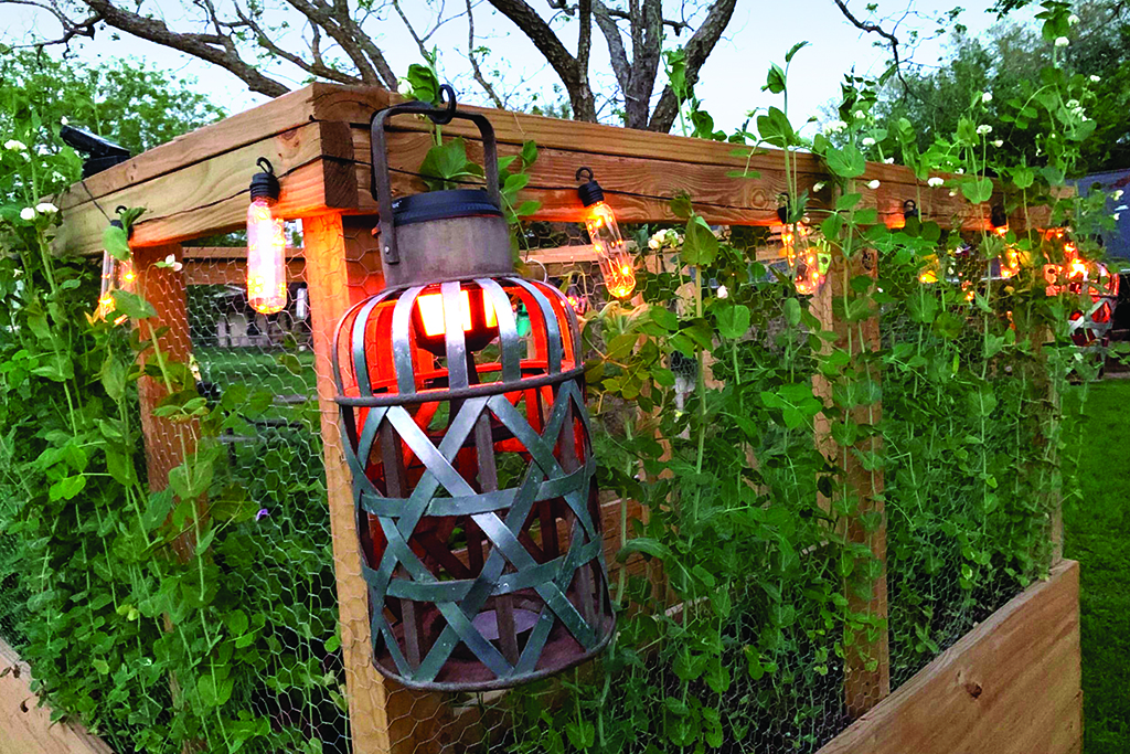 Amy Hayden shelters her raised beds of abundant peas, cucumbers, tomatoes, peppers, onions, and chard from her chickens.