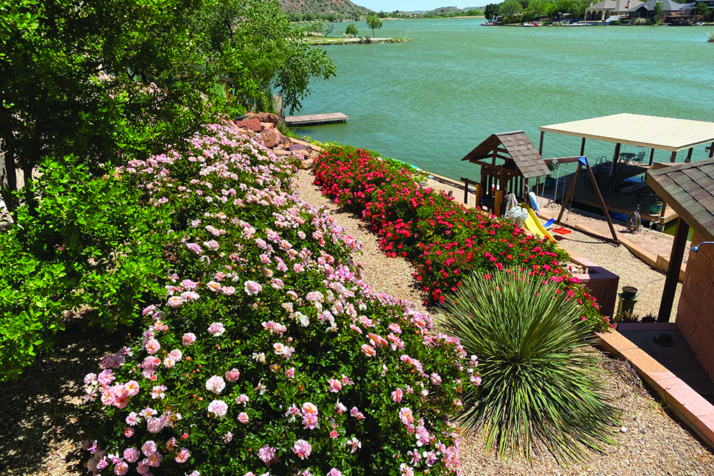 Eddie Turner grows these Drift Roses on a drip irrigation system on two retaining walls going down to the lake.