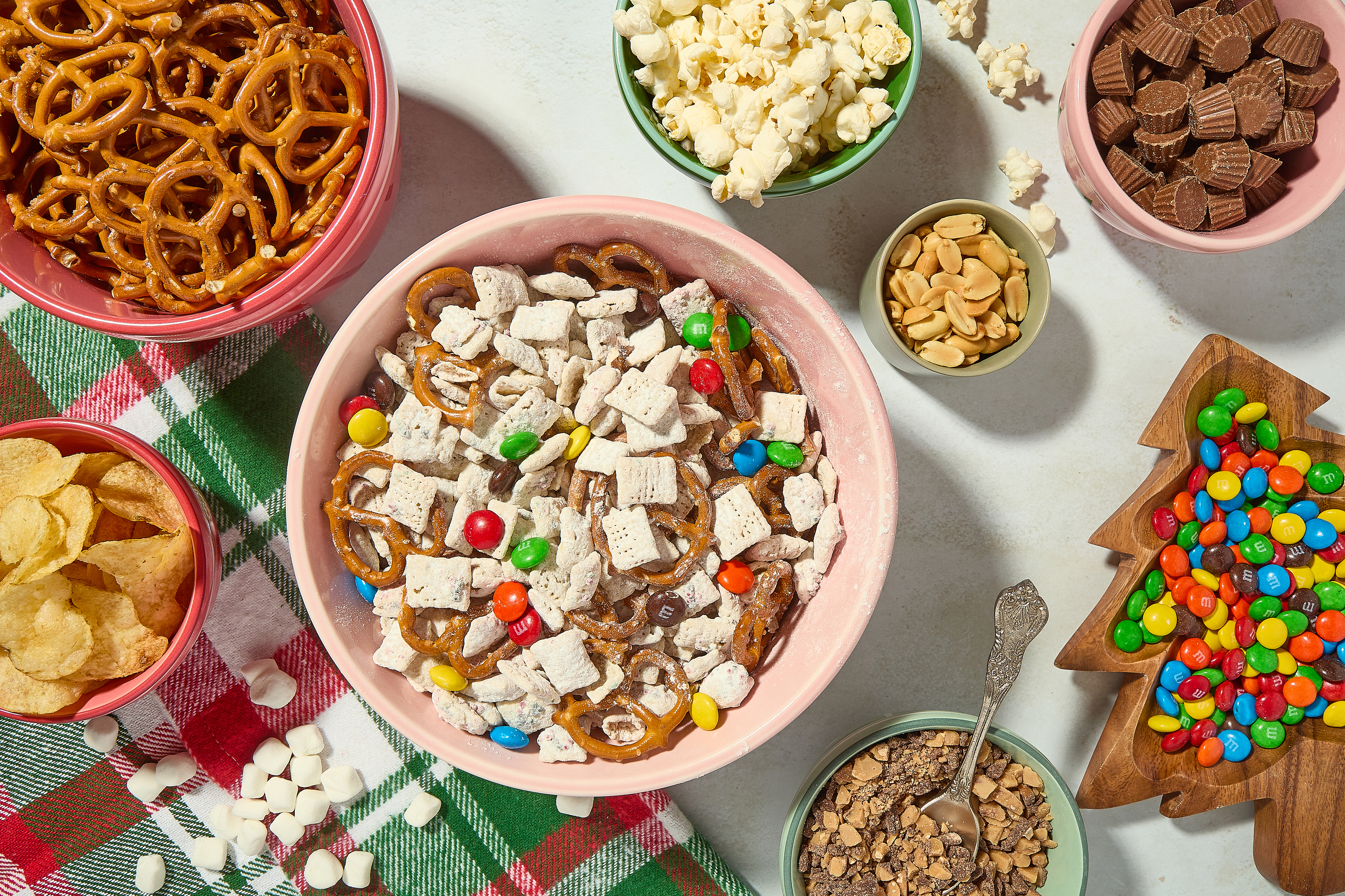 Pretzels, popcorn, salted peanuts, and even kettle chips will add a salty, crispy crunch to reindeer chow.