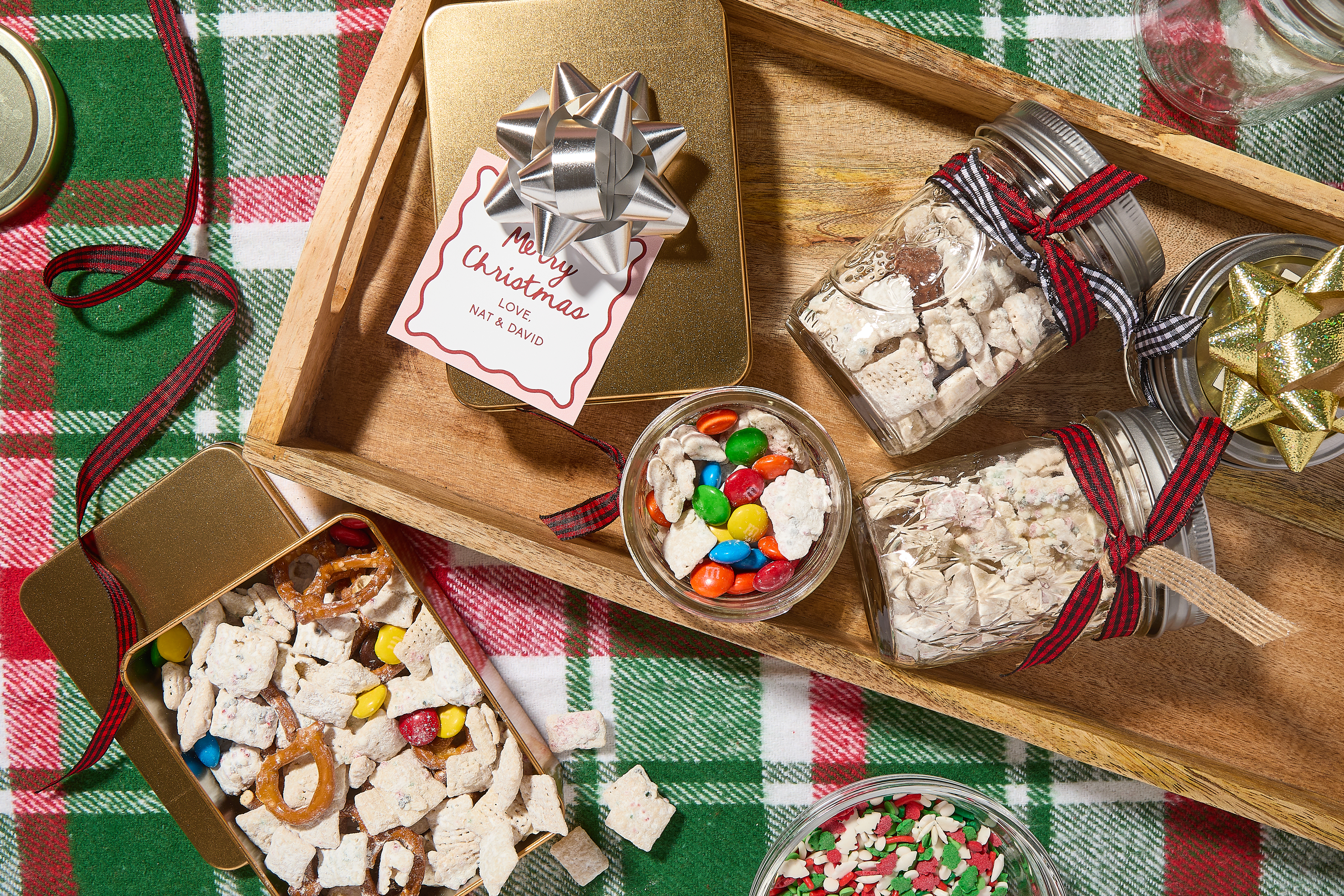 After the reindeer chow has cooled, store it in an airtight container at room temperature. It can also be stored in the freezer for up to six months. Gifting or selling individual containers of reindeer chow at a fundraiser? Pour into Mason jars donned with a plaid ribbon or tin boxes with bows.