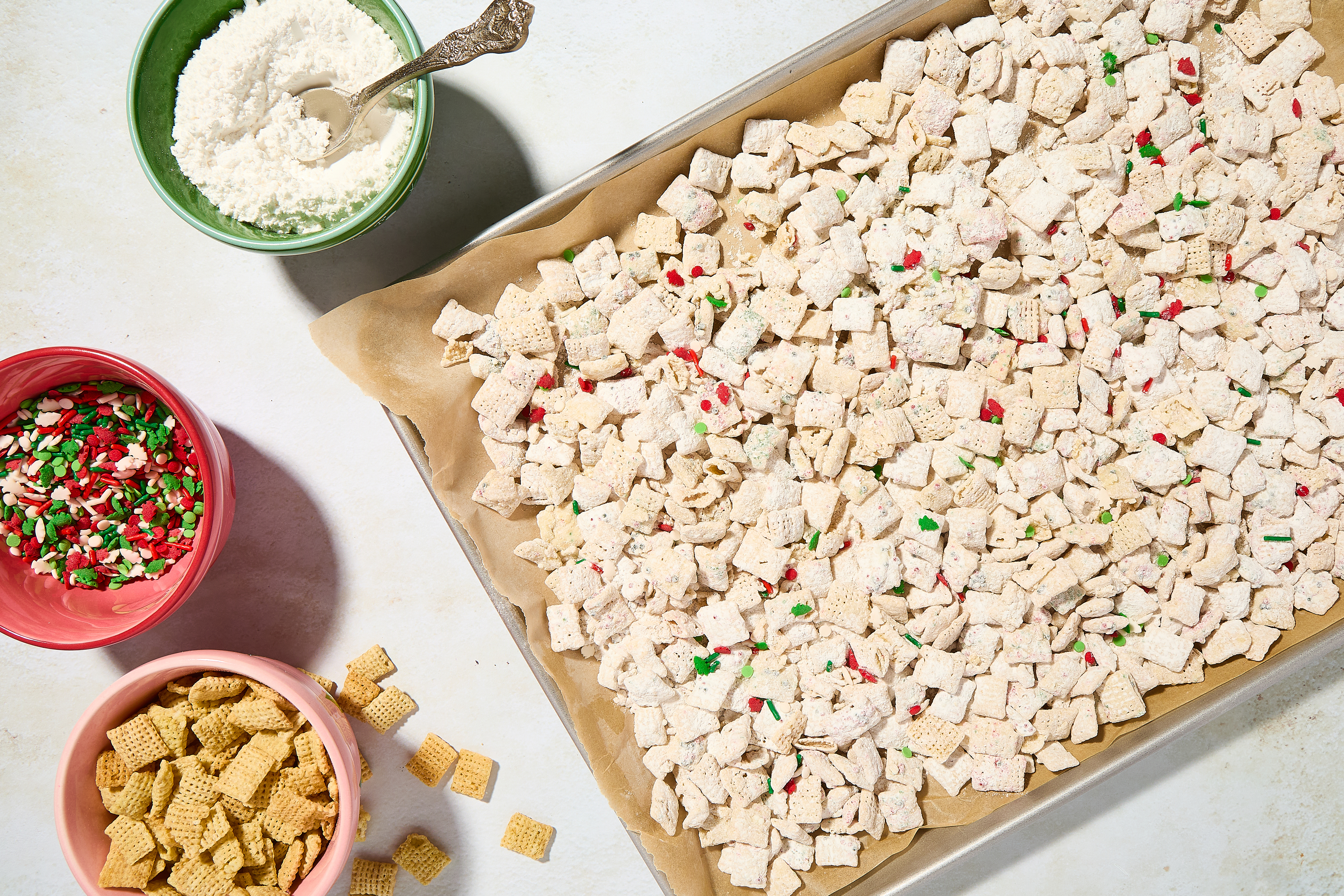 Pour the Chex mixture onto the baking sheet. Allow to harden in the fridge for 10–15 minutes.
