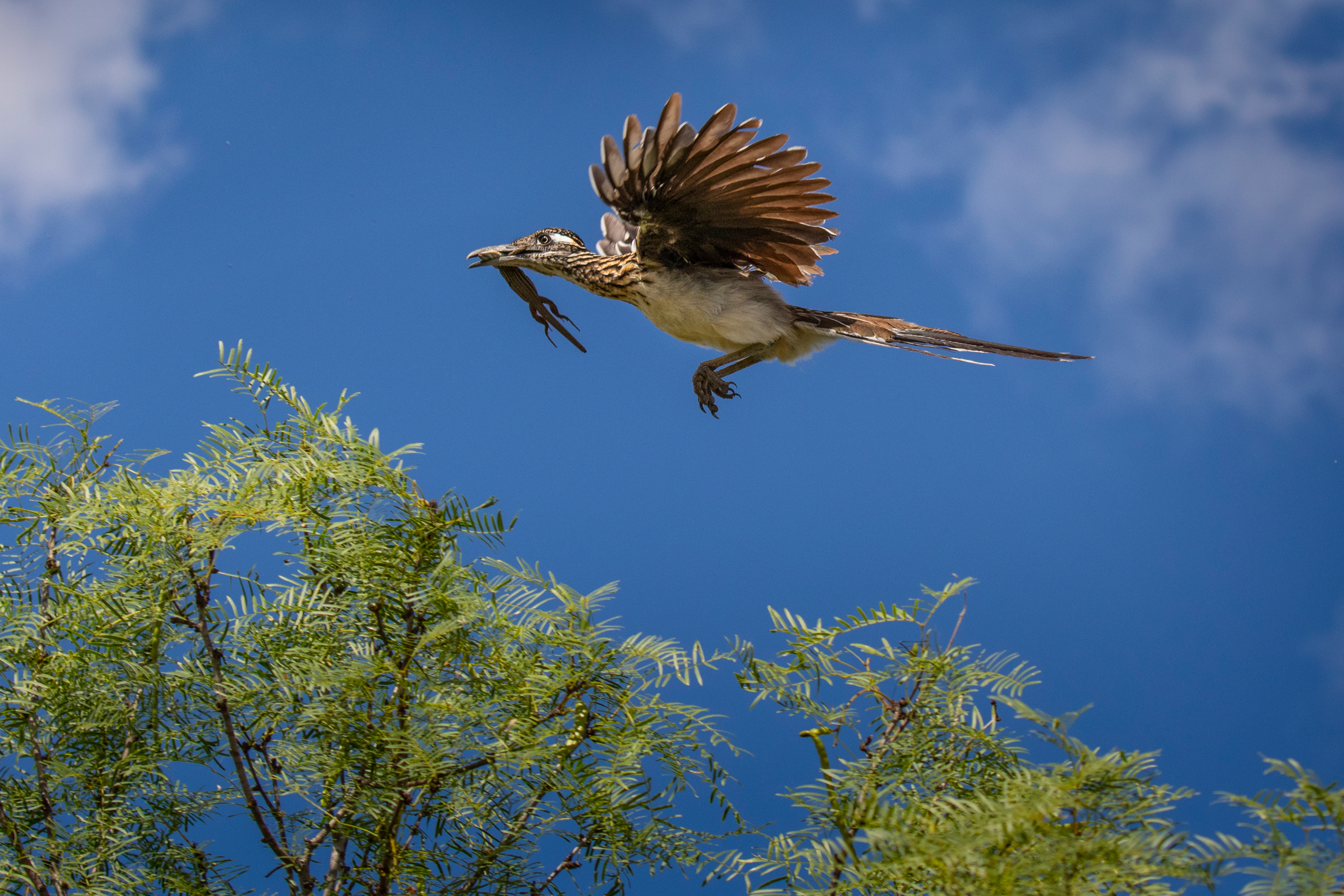 Although roadrunners can fly for short bursts, they prefer to dash around on foot, reaching speeds of up to 20 mph. They run like darts, with their heads low and back parallel to the ground, using their long tails like rudders to keep their balance. Their mottled gray and black plumage helps them keep hidden amid the dusty desert shrubs — an advantage both as the hunter and the hunted.