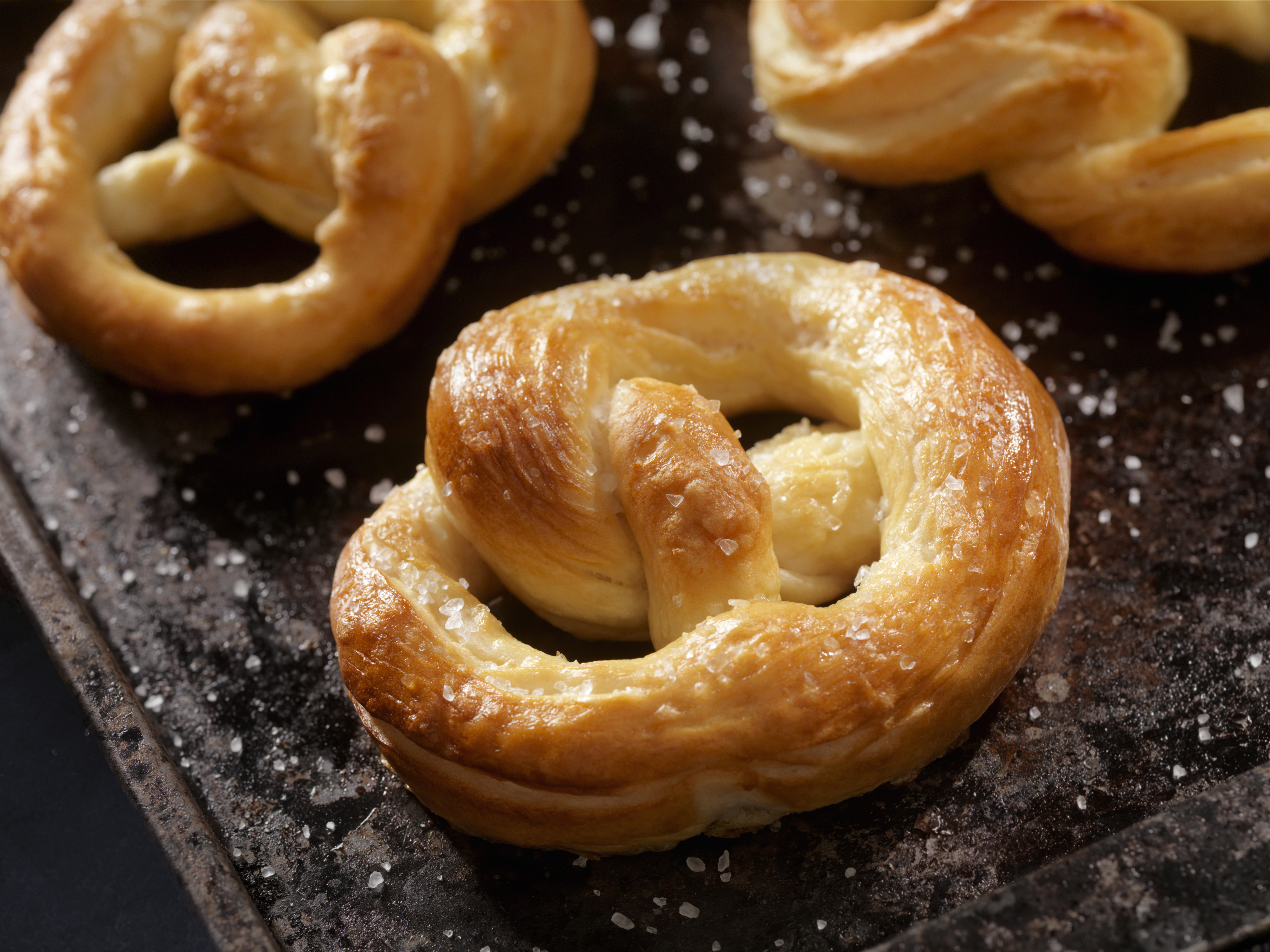 True Bavarian pretzels are larger than your head and can be ripped apart in large chunks of sweet, salty bread by a large number of family and friends sitting around the table. The trick to getting them right is a lively yeast, an egg glaze, and letting them have plenty of room to breathe in the oven. Yield: 10 pretzels.