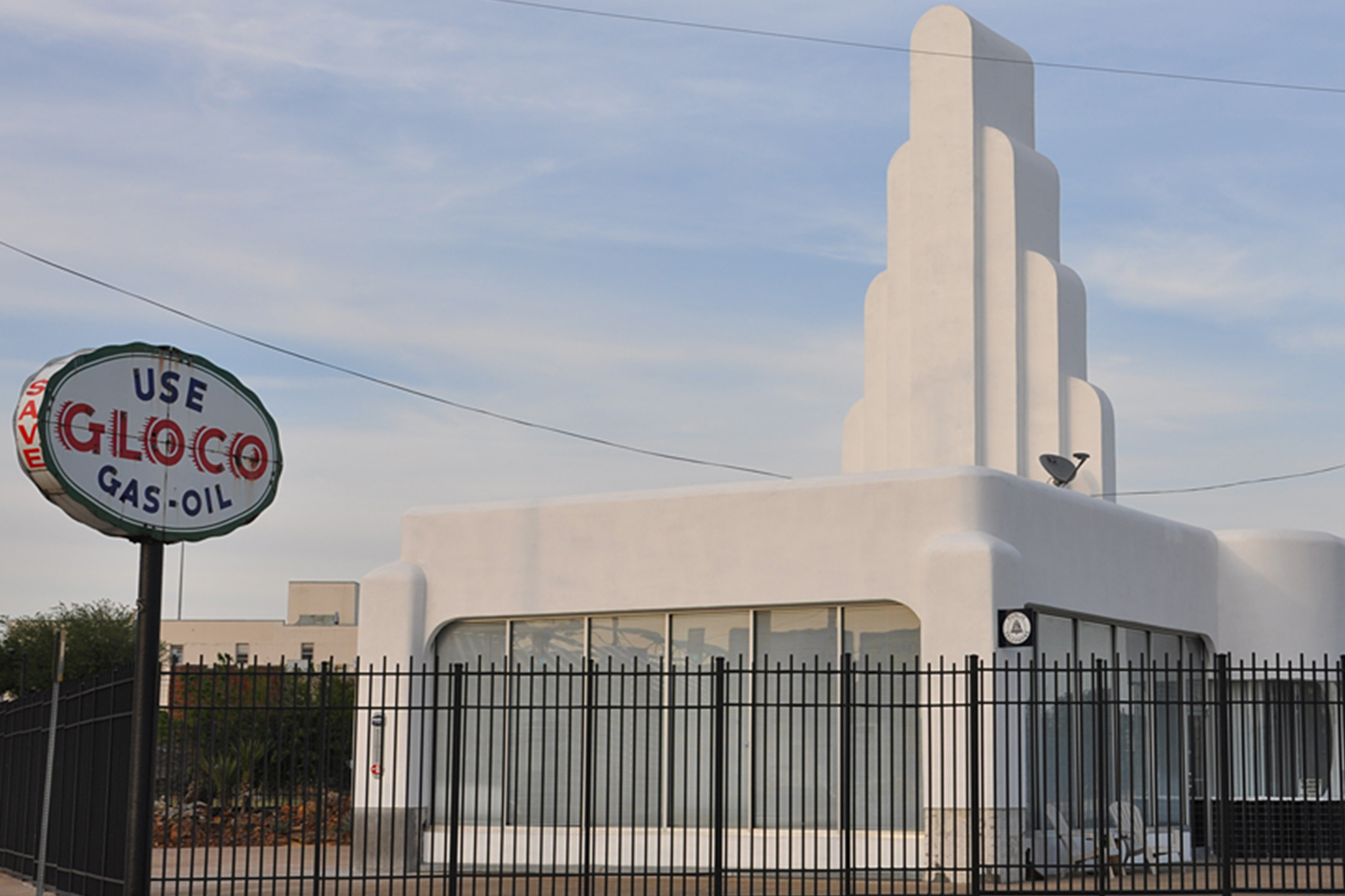Good Luck Oil Company was one of the earliest oil companies in Dallas, and the first to sell gasoline made from East Texas oil. GLOCO’s owner, A.E. Wilemon, built this gas station in 1939, inspired by a trip to the Texas Centennial at Fair Park, complete with a 35-foot stepped tower, white stucco walls, black ceramic tile, and snazzy neon lights. Today, this slice of Dallas history is a registered landmark.