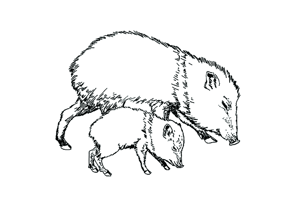 How to Spot Them: At a quick glance, you might mistake a javelina for a wild boar, but the black-and-gray mammals are smaller, have a ring of light-colored hair around their neck and shoulders, and have little, sharp tusks that point downward.
