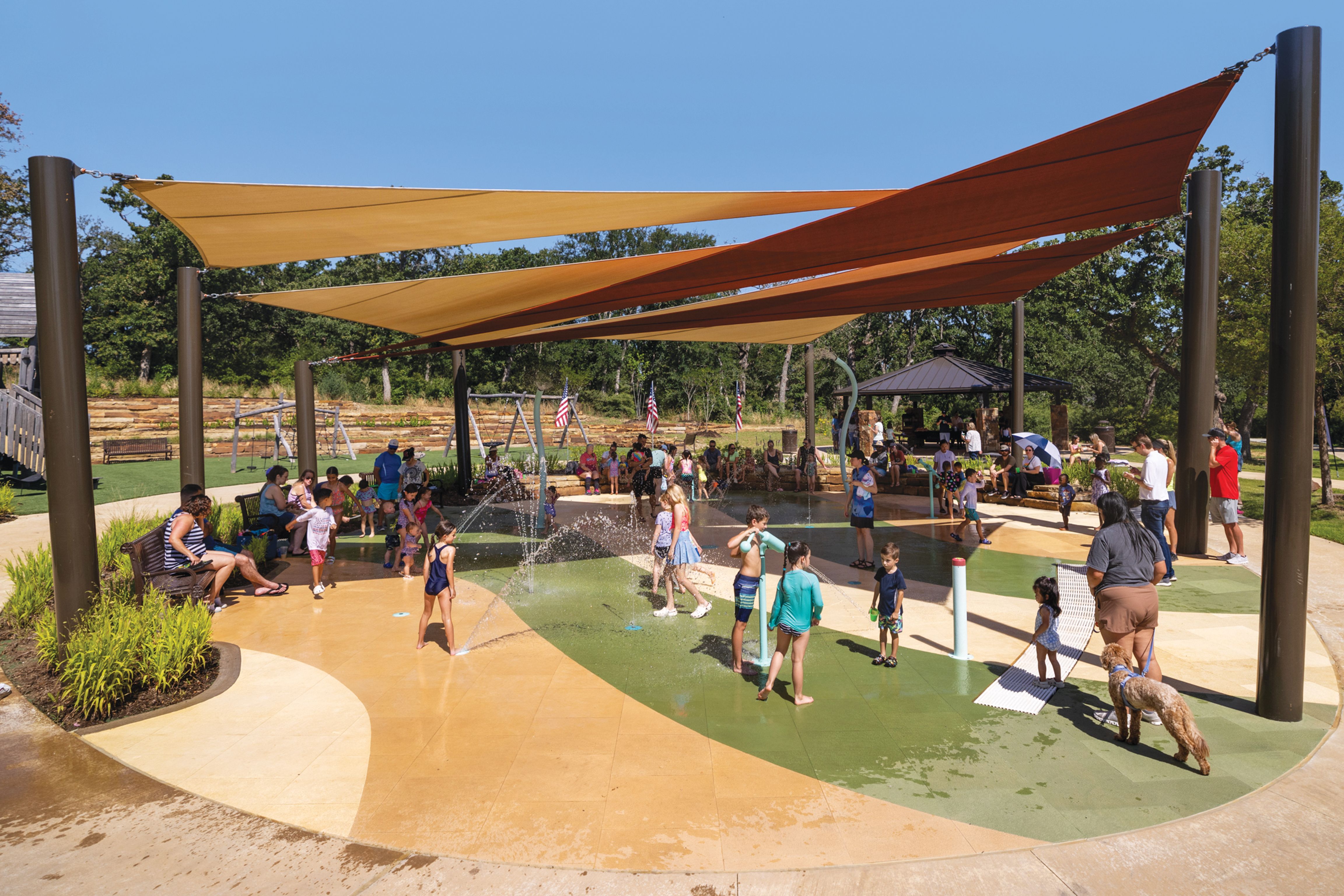 Flower Mound’s new 2,100-square-foot splash pad pulls out all the stops with 12 unique water fixtures, shade canopies, and safety surfacing. With its 4,900-gallon holding tank filtering around 260 gallons per minute, you can expect clean, fresh water throughout the day.